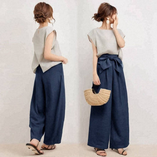 Batwing Short Sleeve Top + Tie Waist Wide Leg Pants Set
