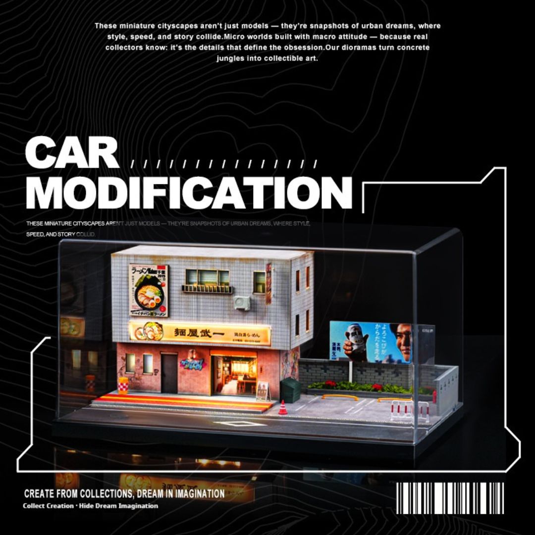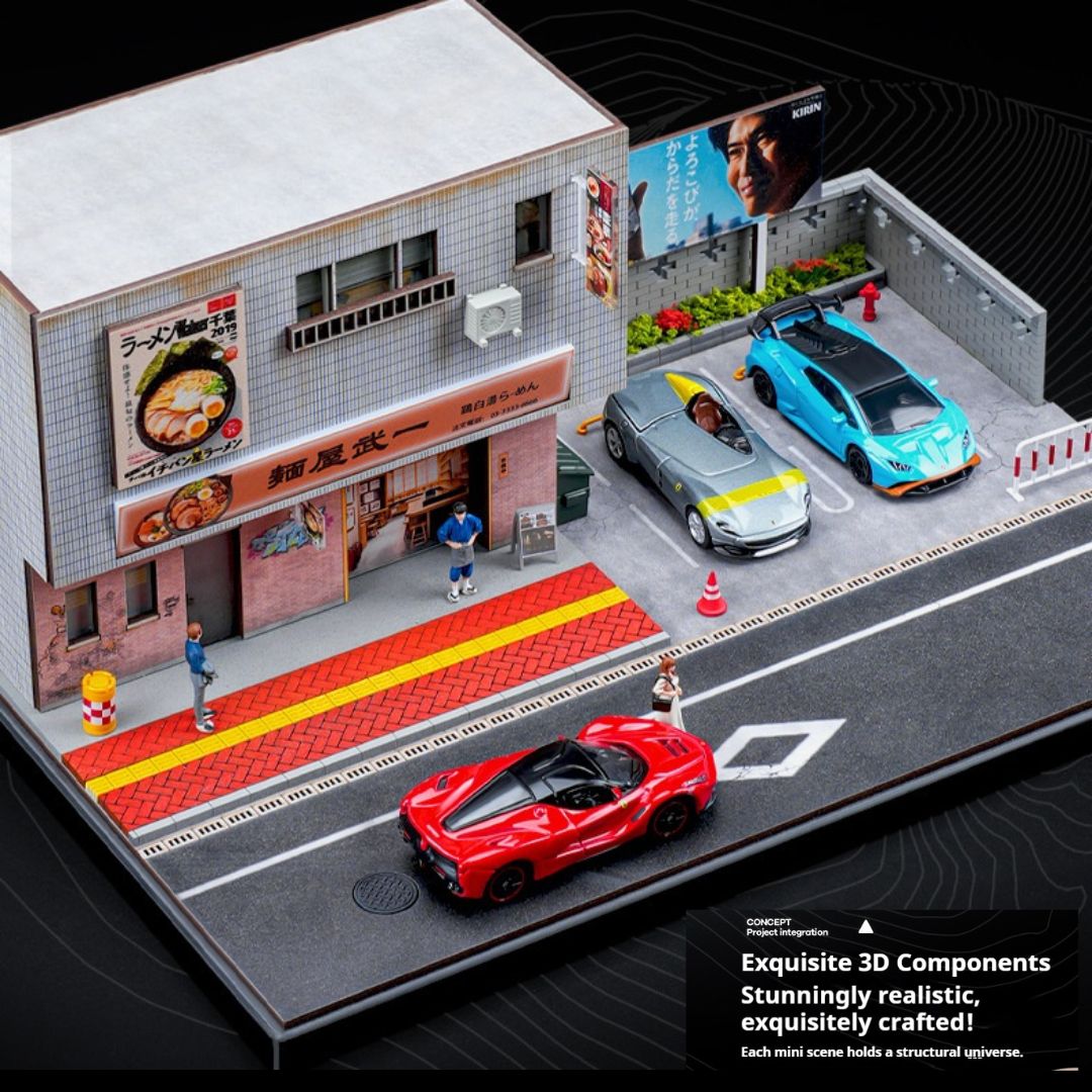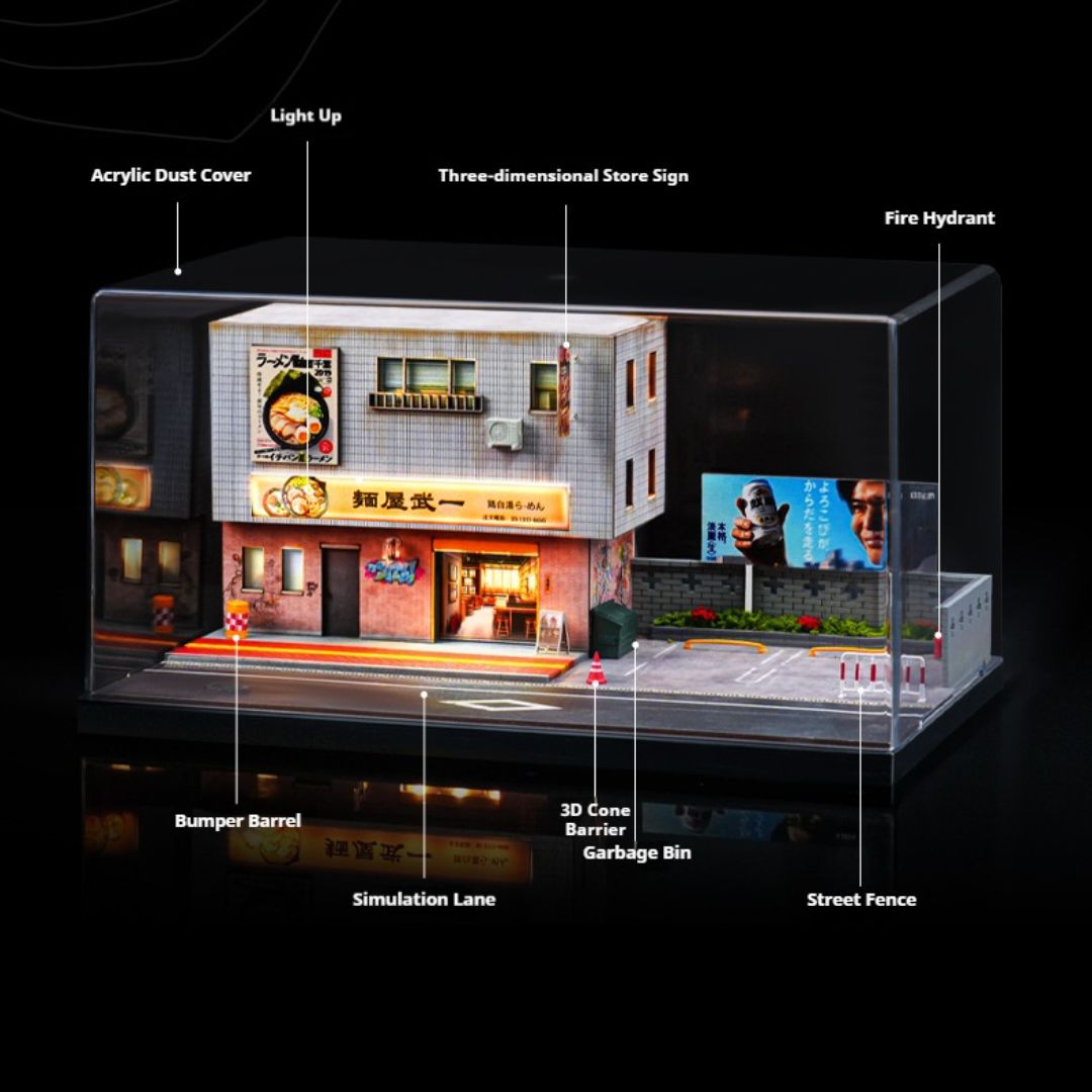 この精巧な1/64スケールのミニチュアモデルで、日本のラーメン屋の魅力をデスクに再現!車モデル愛好家やコレクターにぴったりのジオラマで、LED照明付きで温かみのある雰囲気を作り出します。
