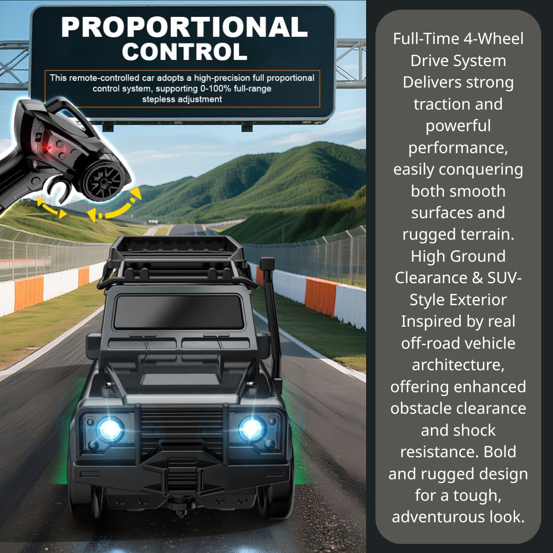 · 🏁 SUVスタイルのエクステリア:実車のオフロード車両をモデルに、地上高と耐衝撃性を高めました。力強い印象を与える、頑丈で大胆なデザインです。