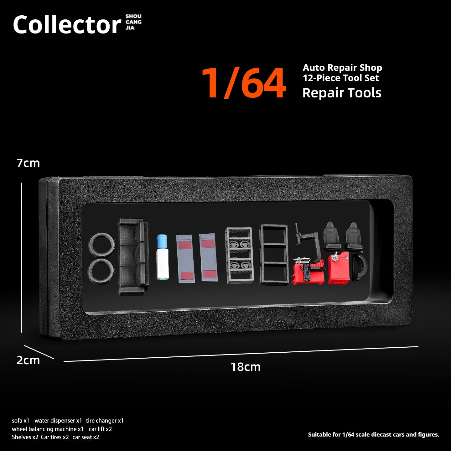 這款1:64比例的仿真汽車維修工具套裝模型,專為愛好者和收藏家設計。每件工具均採用高品質樹脂精心製作,色彩鮮豔且細節精緻。
