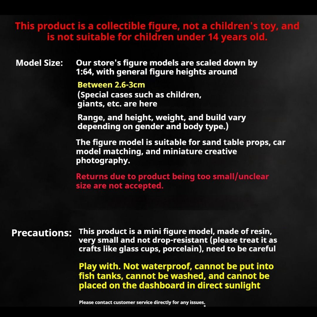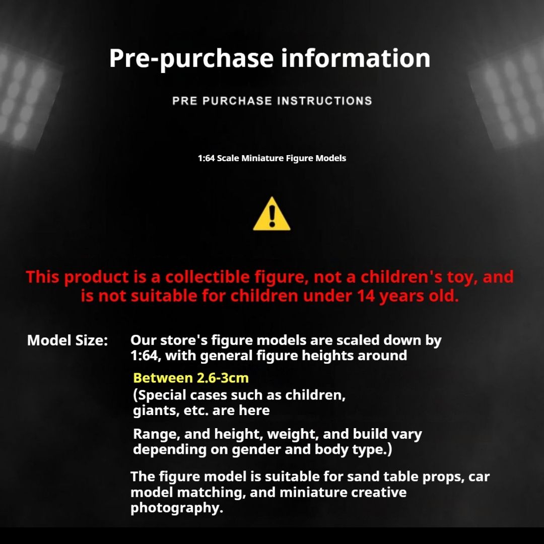 這些1/64比例的仿真人偶模型,專為您的場景模型、沙盤或展示增添真實感與細節。每個迷你人偶均精心製作,姿勢生動且色彩鮮豔。