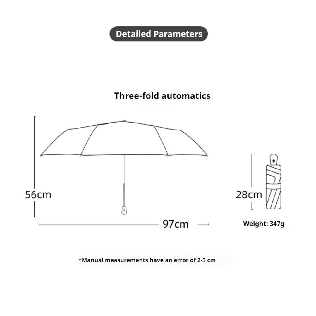 - ☔自動開啟/關閉:只需按一下按鈕,雨傘就會自動開啟和關閉,即使單手也能輕鬆使用。