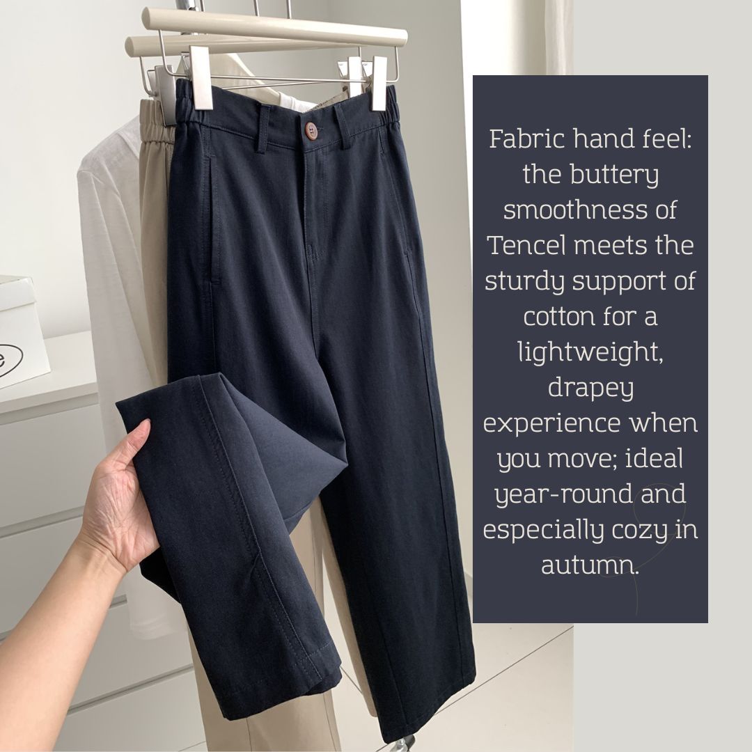 💮布料手感:天絲的柔順與棉的穩定兼具,走動時有輕盈垂墜;四季皆宜,秋季尤舒適。