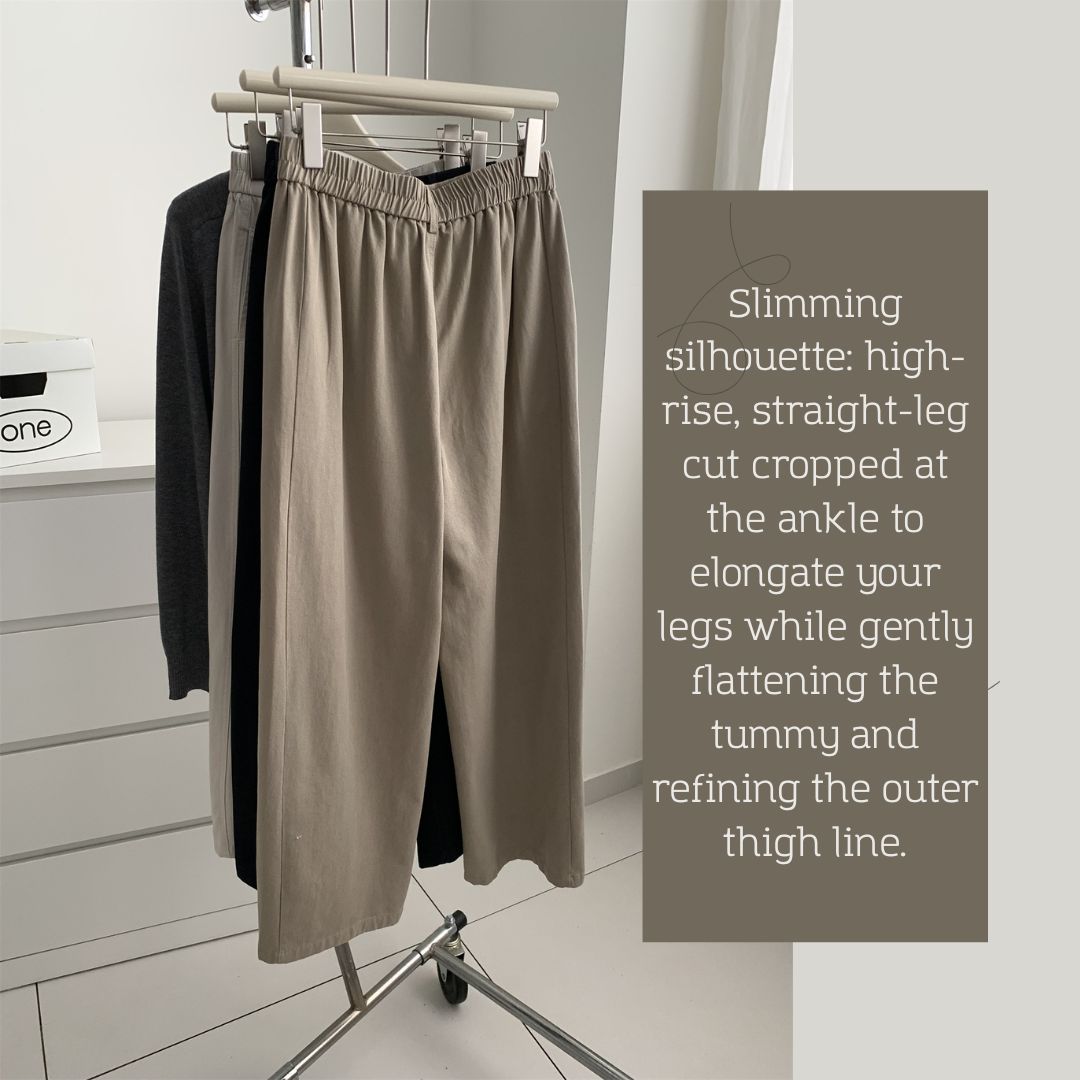 💯修身輪廓:高腰直筒九分長,延伸腿部比例,修飾小腹與大腿外側線條。