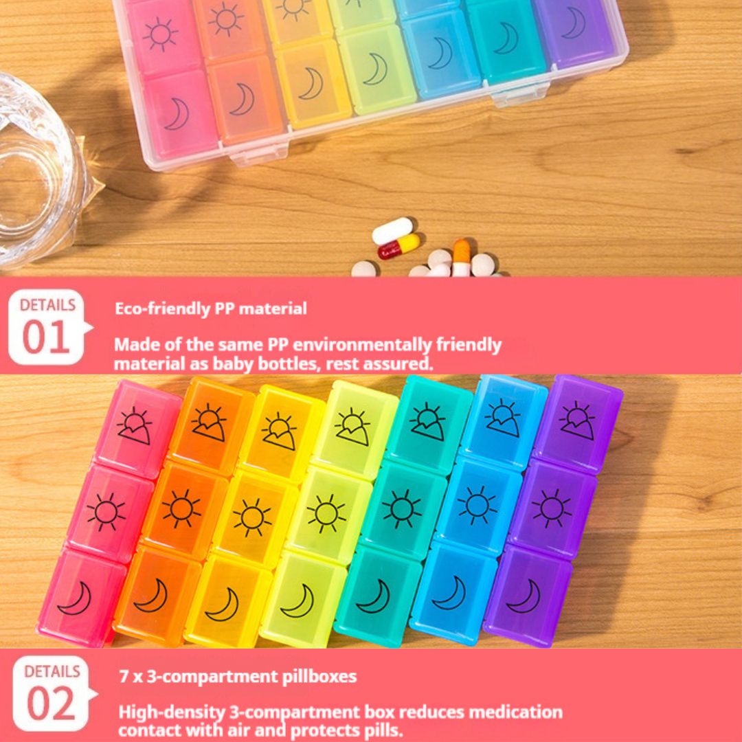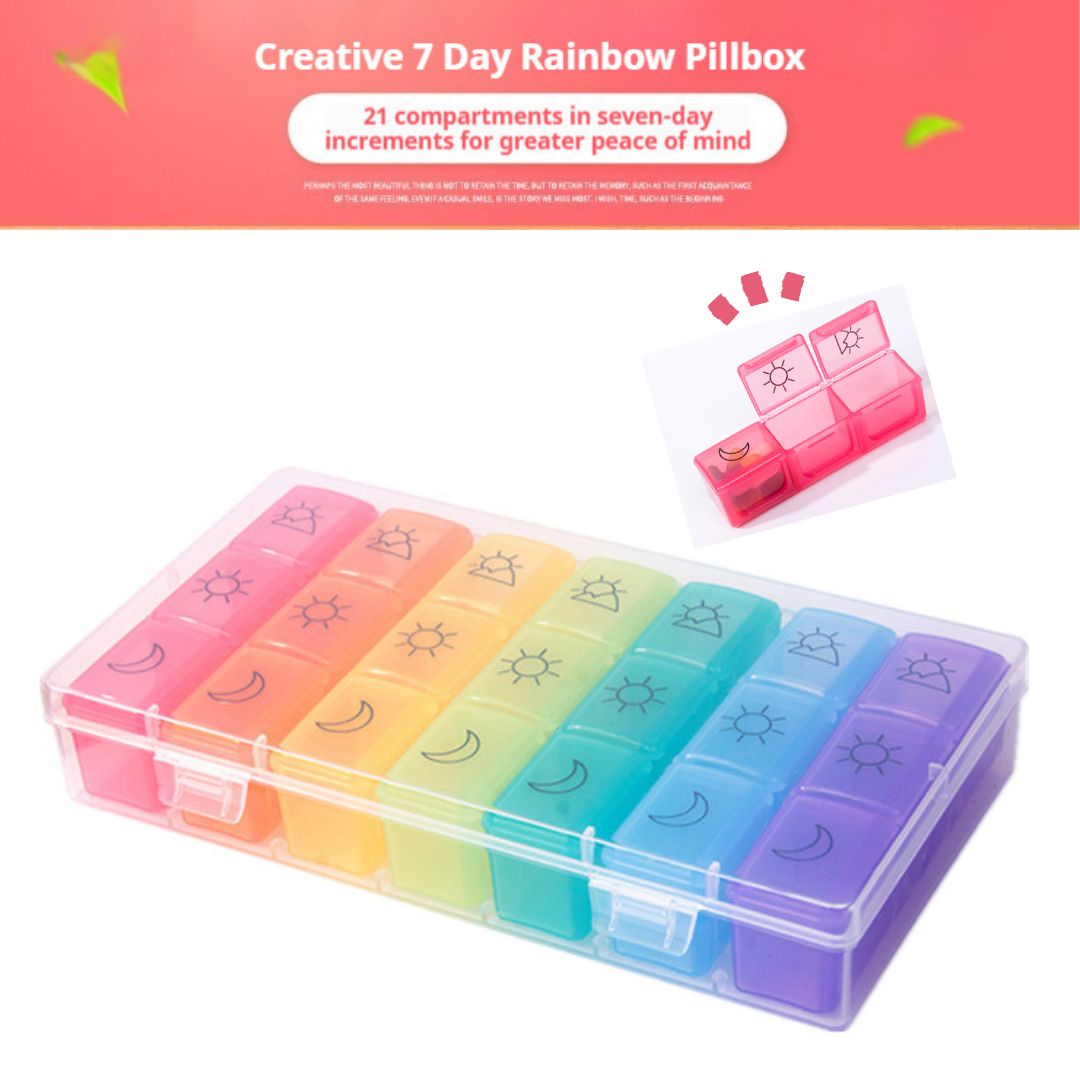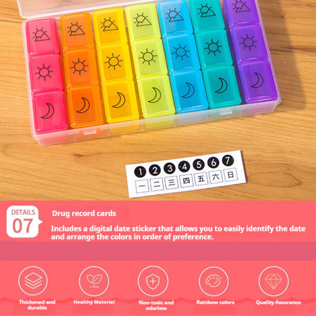 - 多功能設計 🌈:彩虹7天21格藥盒提供每週7天、每天3次的藥物分配,方便管理每日用藥。