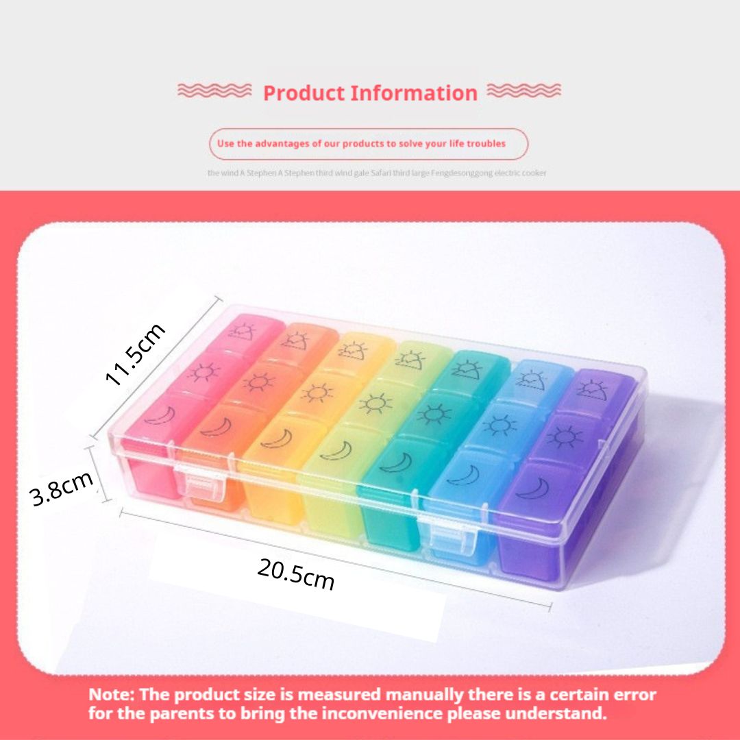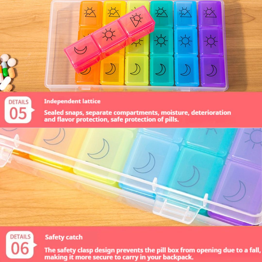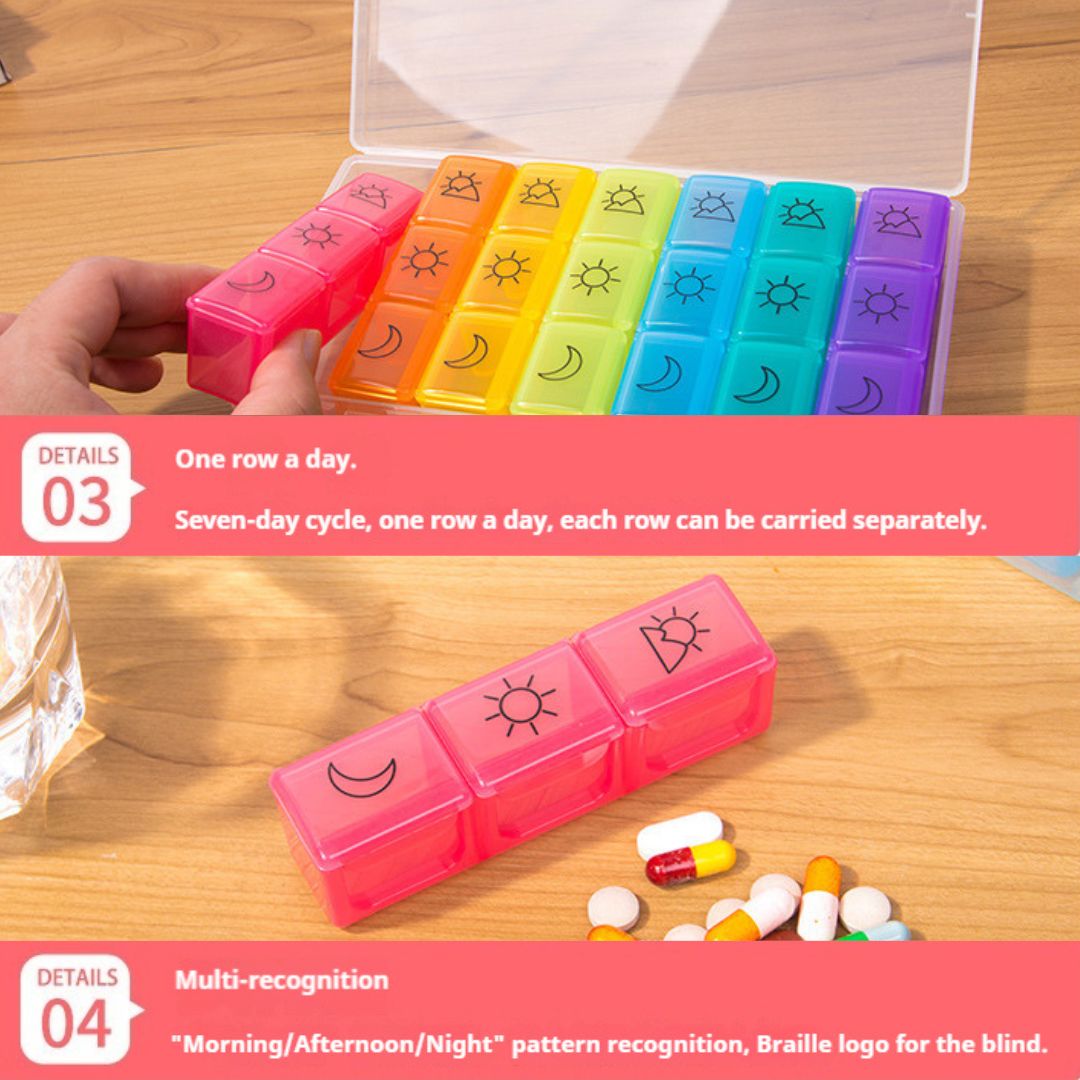 - 多功能設計 🌈:彩虹7天21格藥盒提供每週7天、每天3次的藥物分配,方便管理每日用藥。