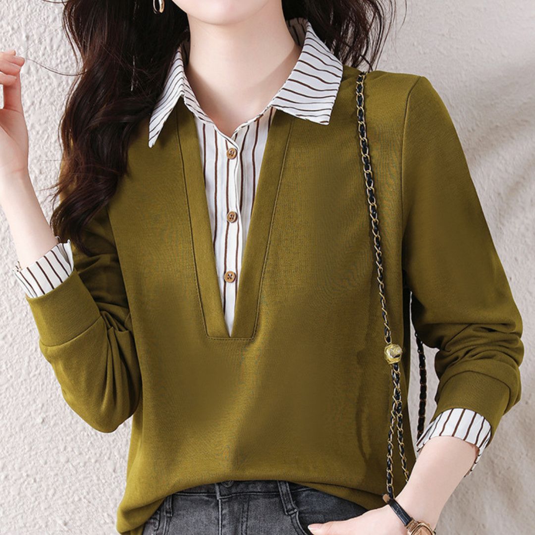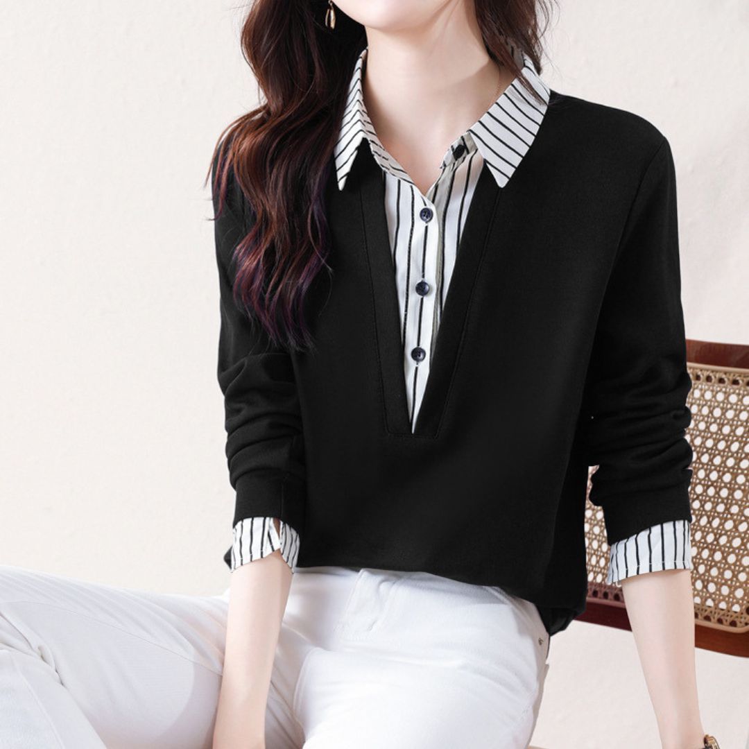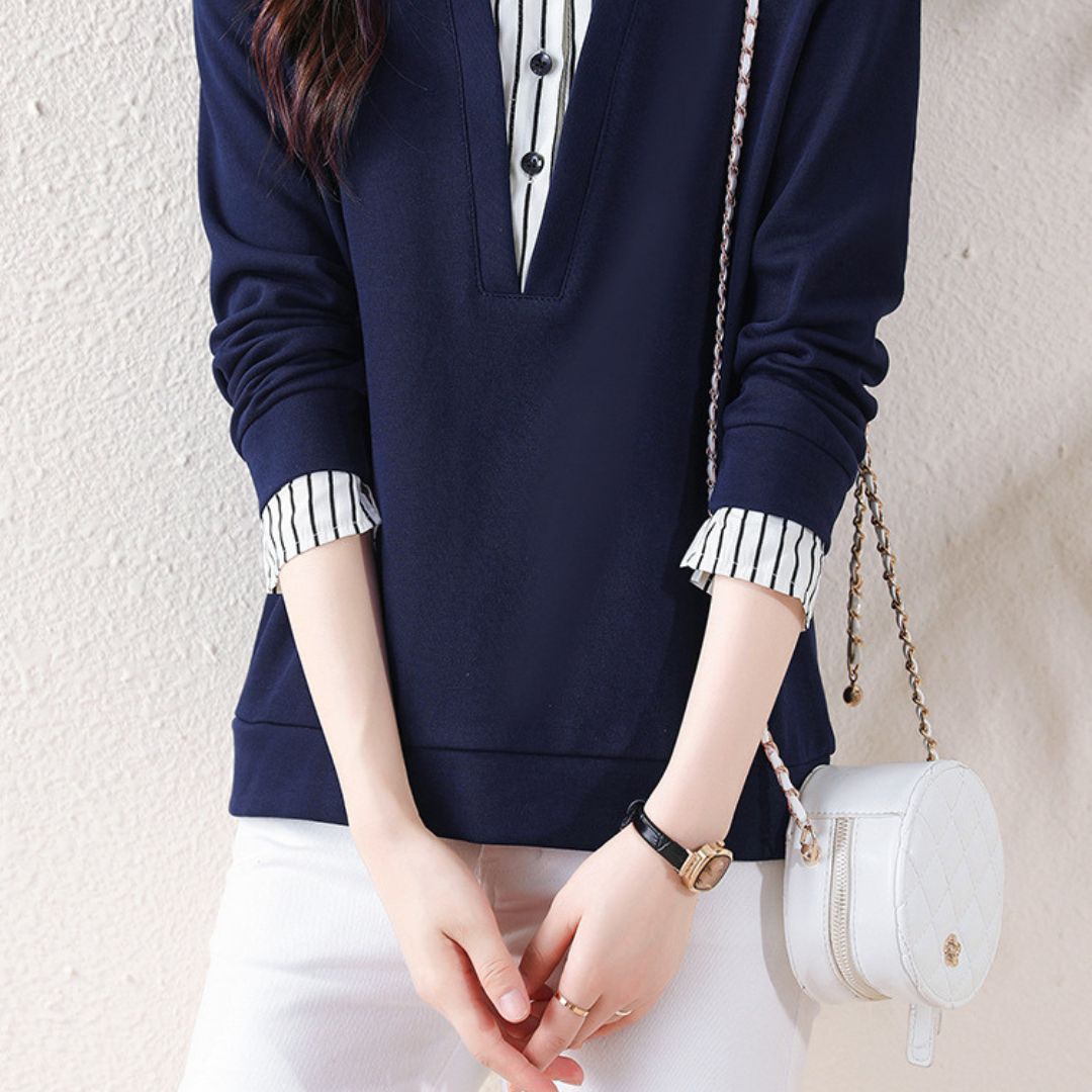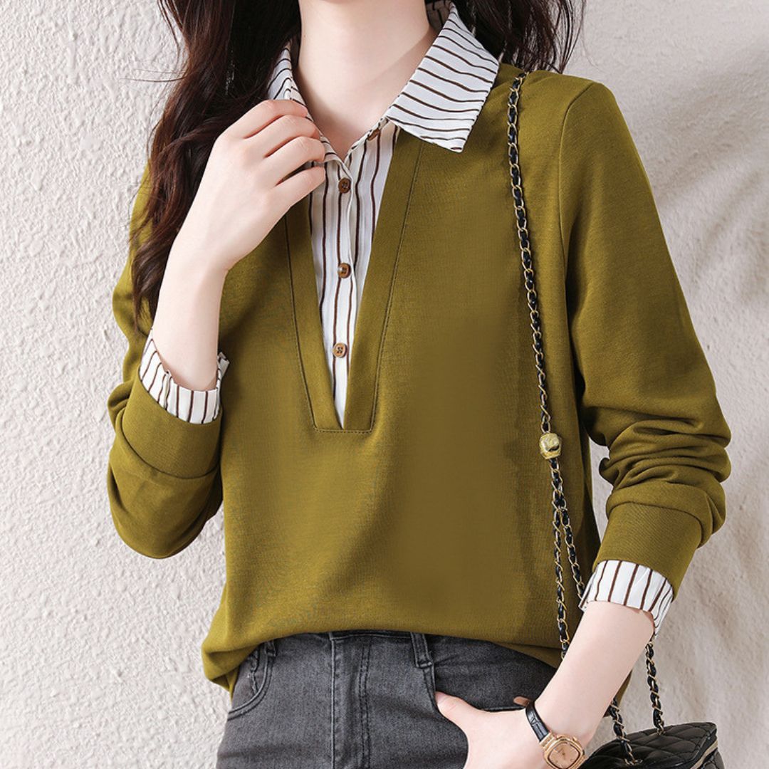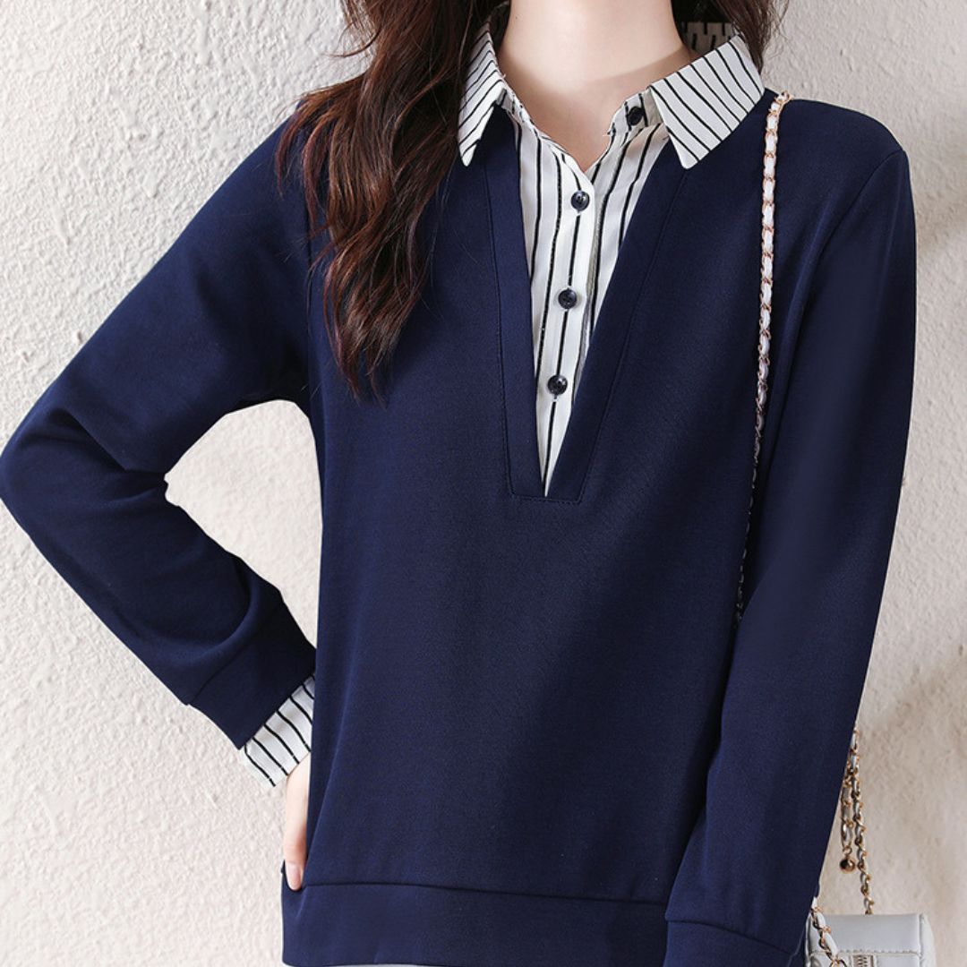 - 復古拼接設計:條紋翻領結合襯衫式袖口,營造「不用疊穿」的立體視覺效果。