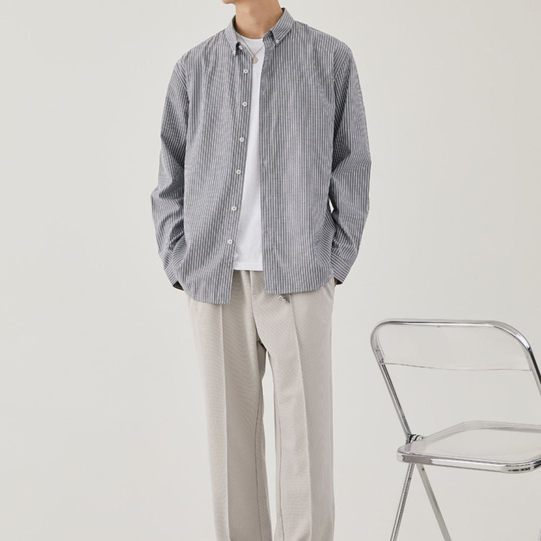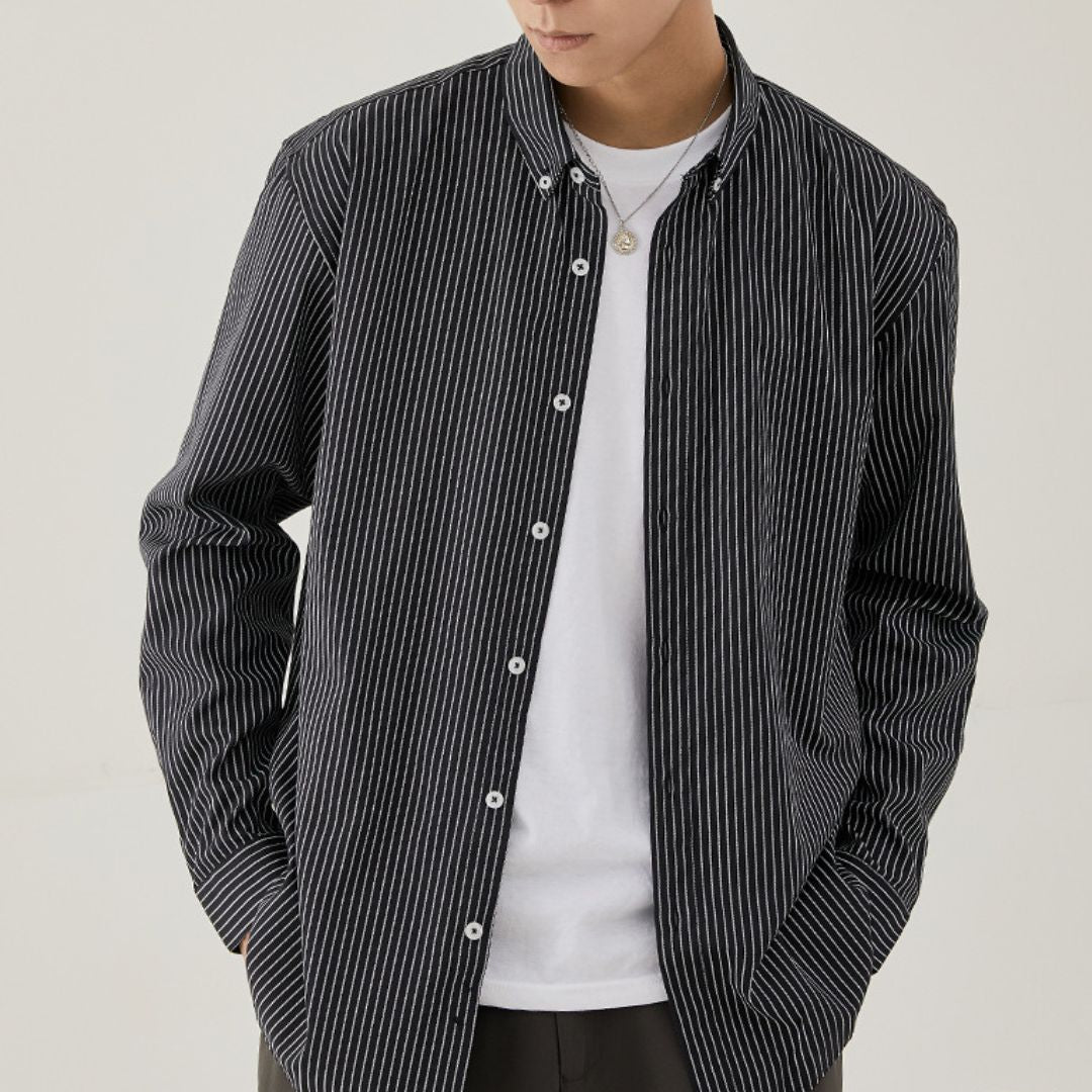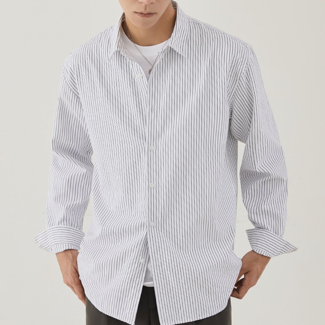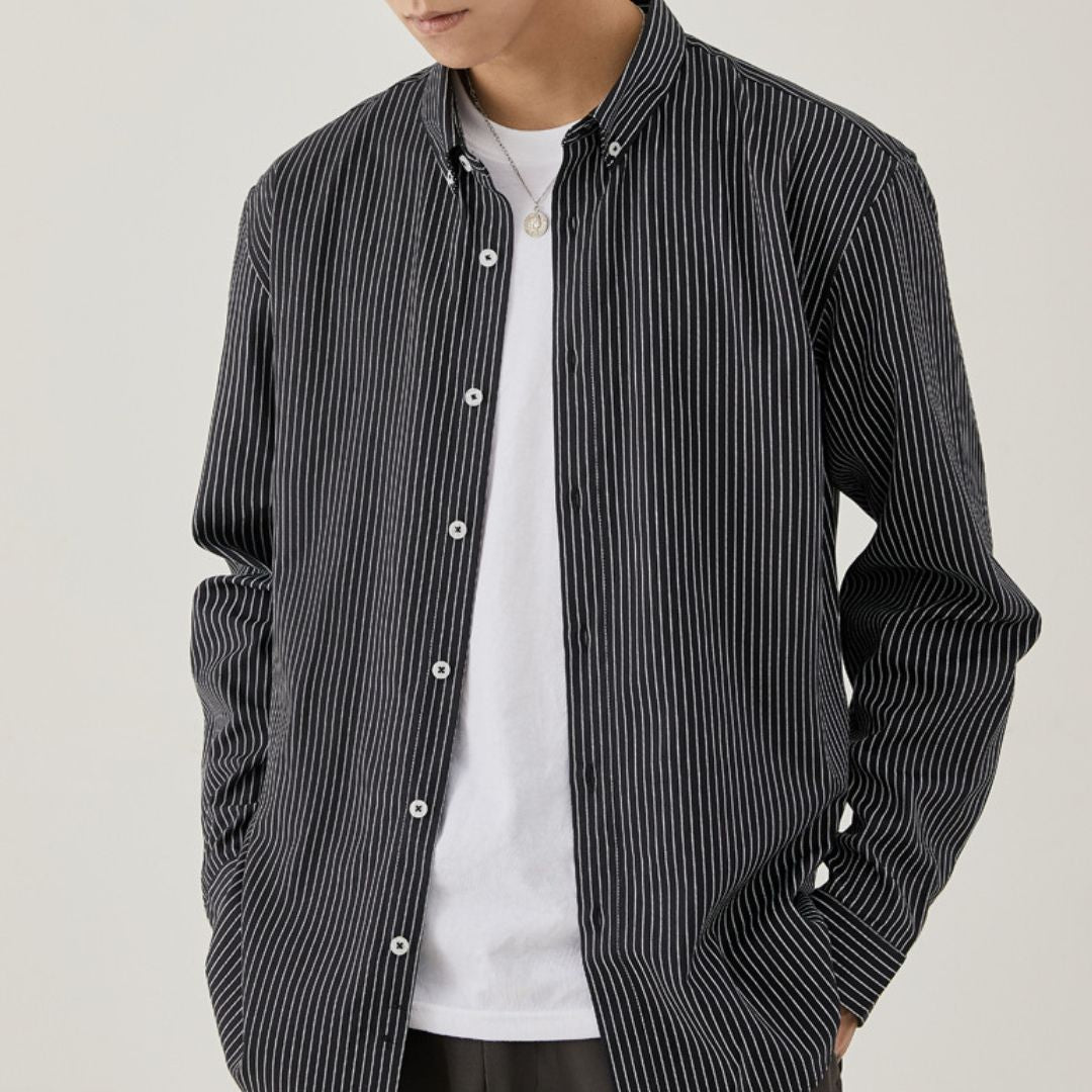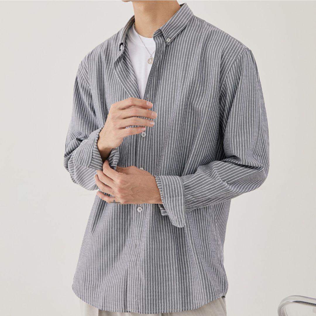 🌟 春秋新款商務休閒條紋翻領開衫長袖男裝襯衫