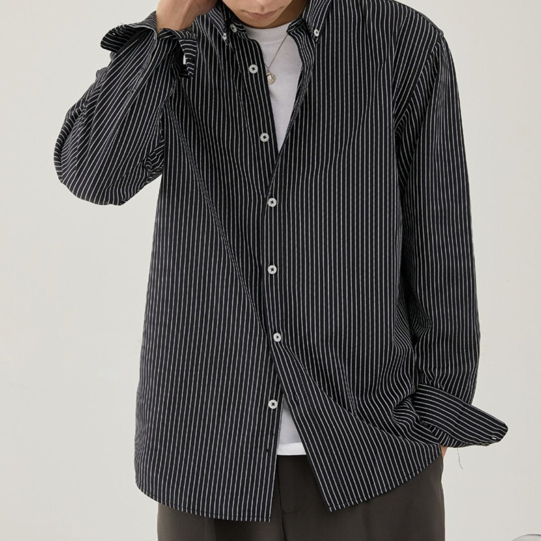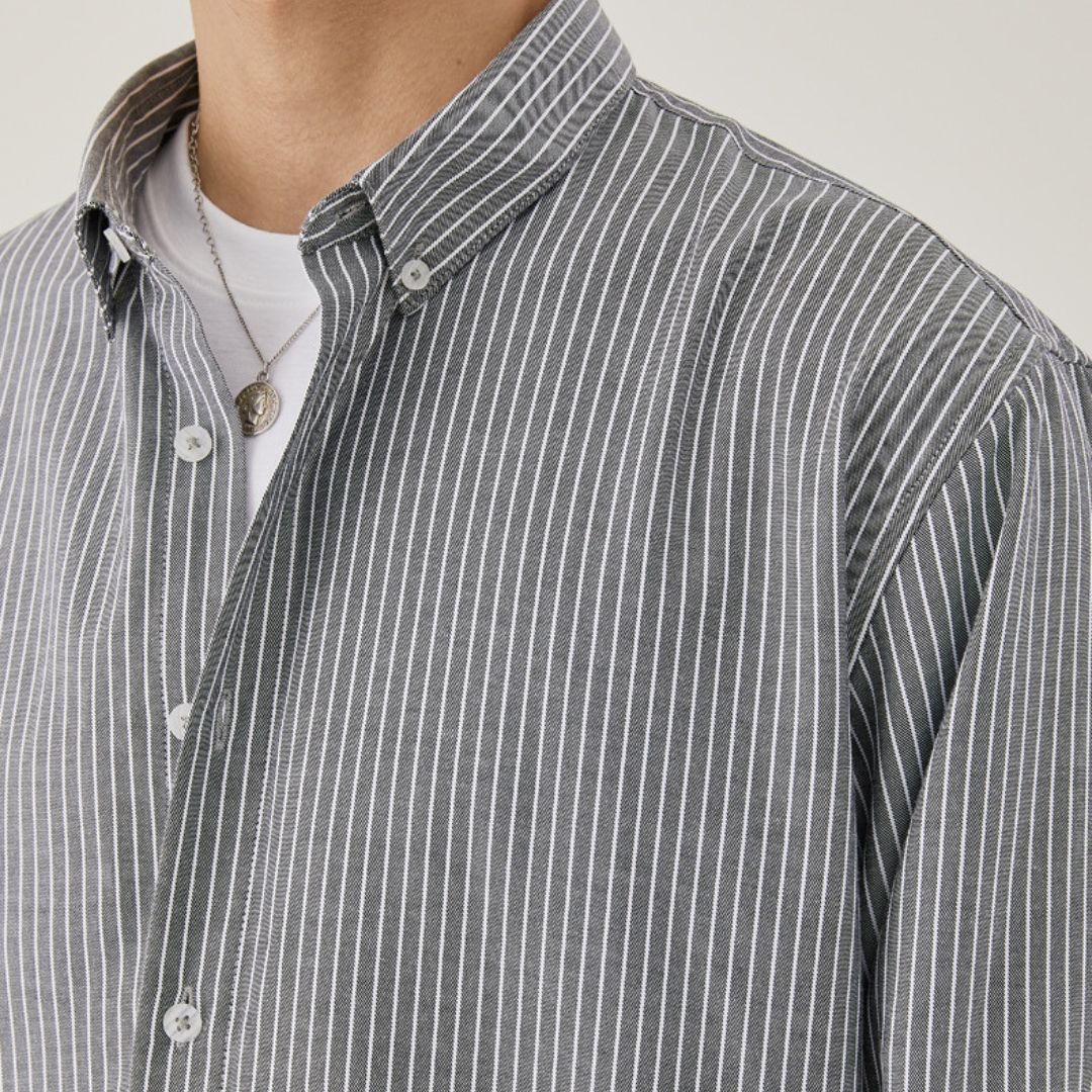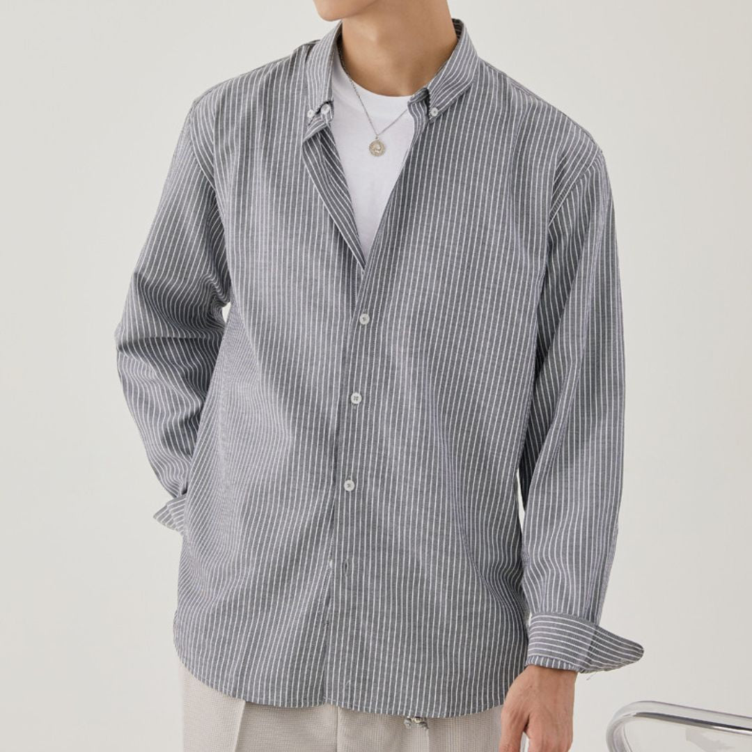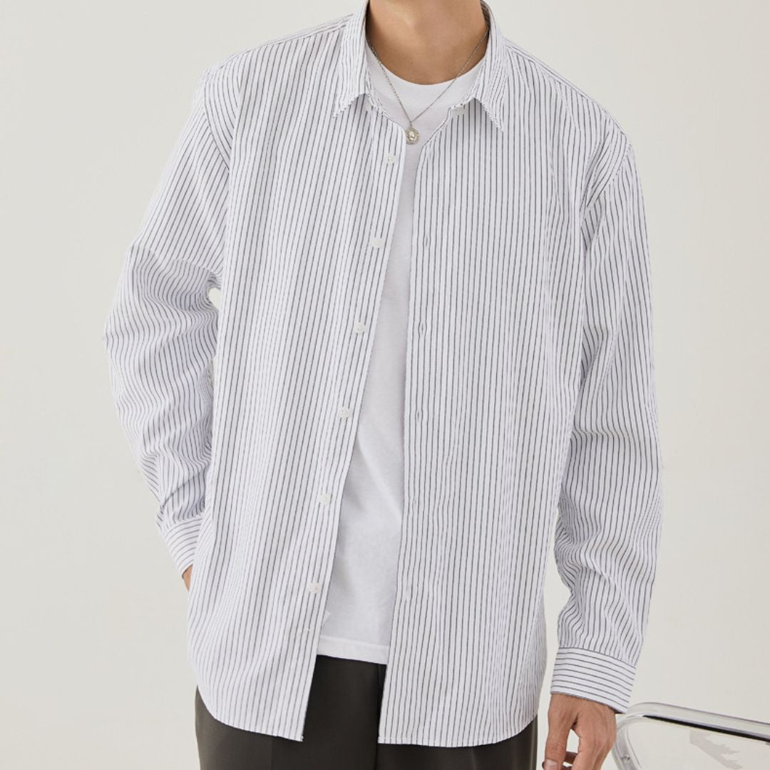 🌟 春秋新款商務休閒條紋翻領開衫長袖男裝襯衫