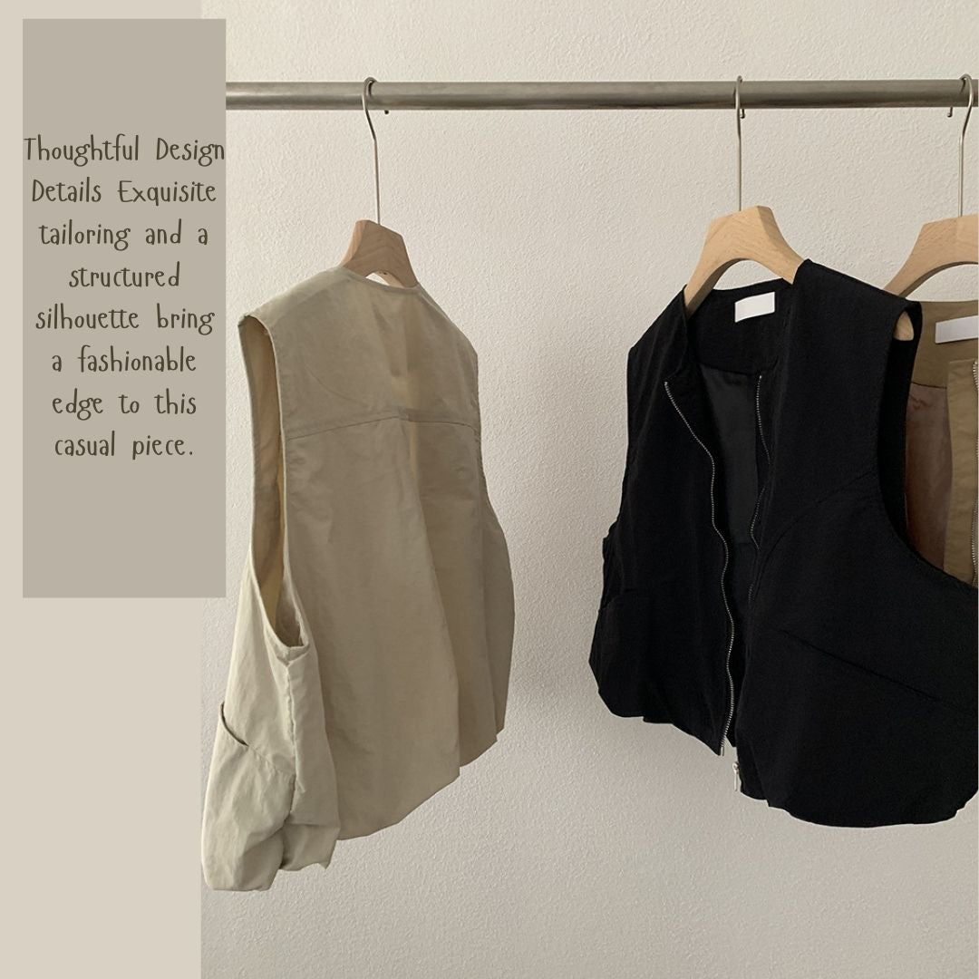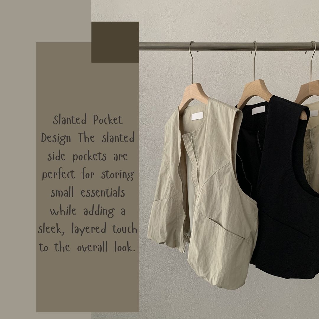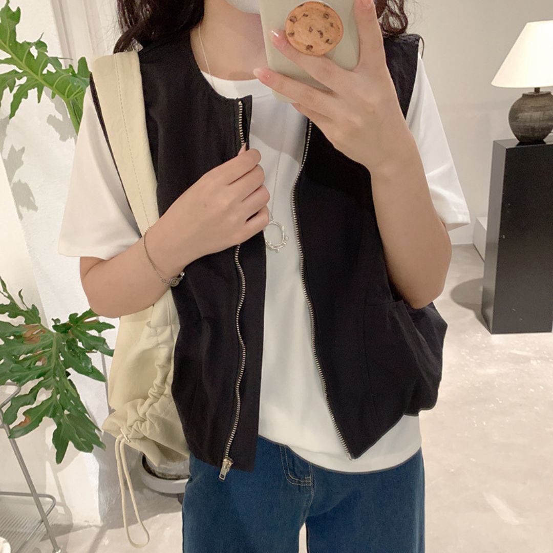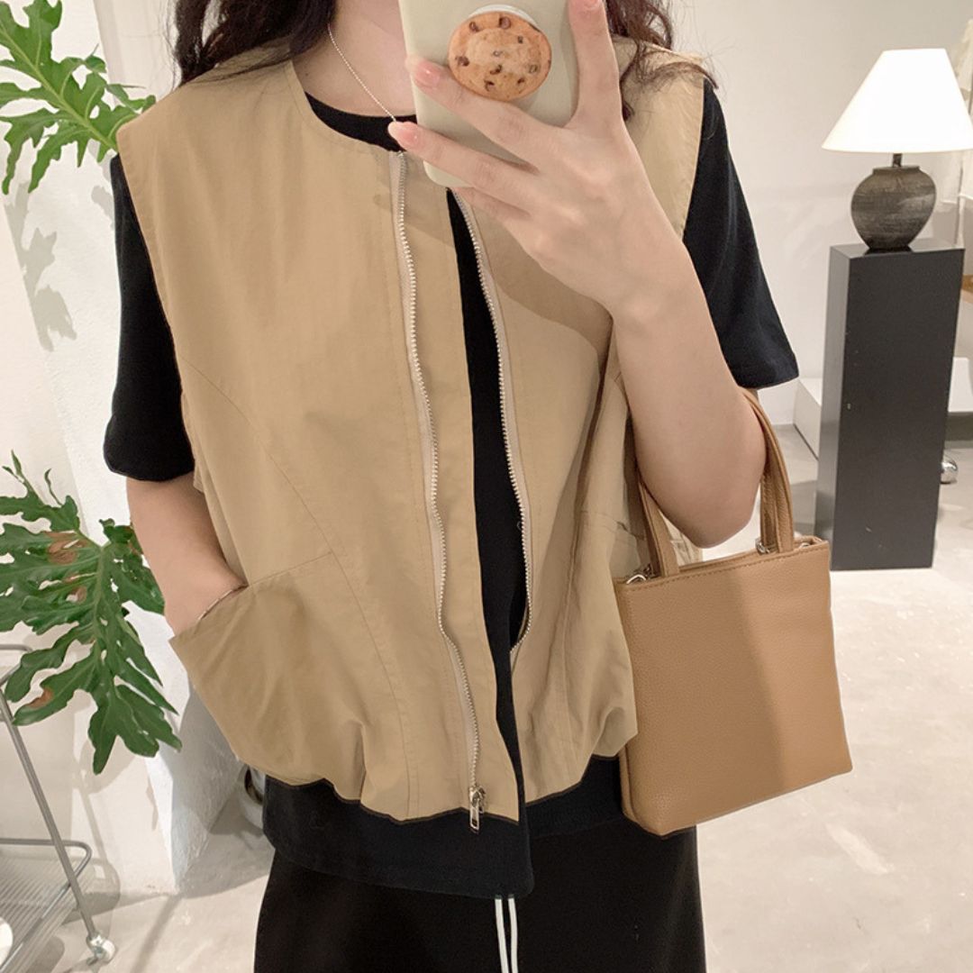 女士簡約斜口袋拉鍊背心