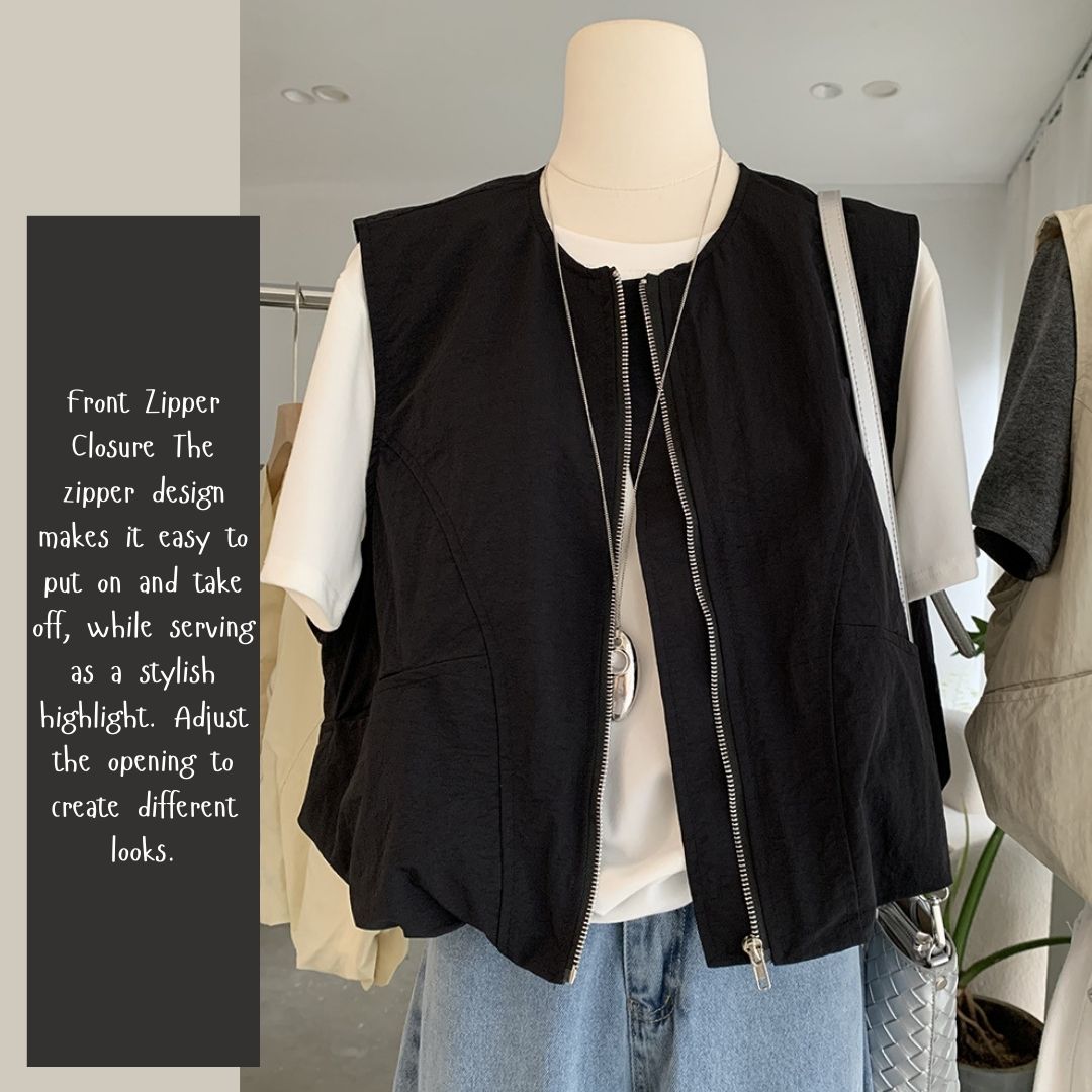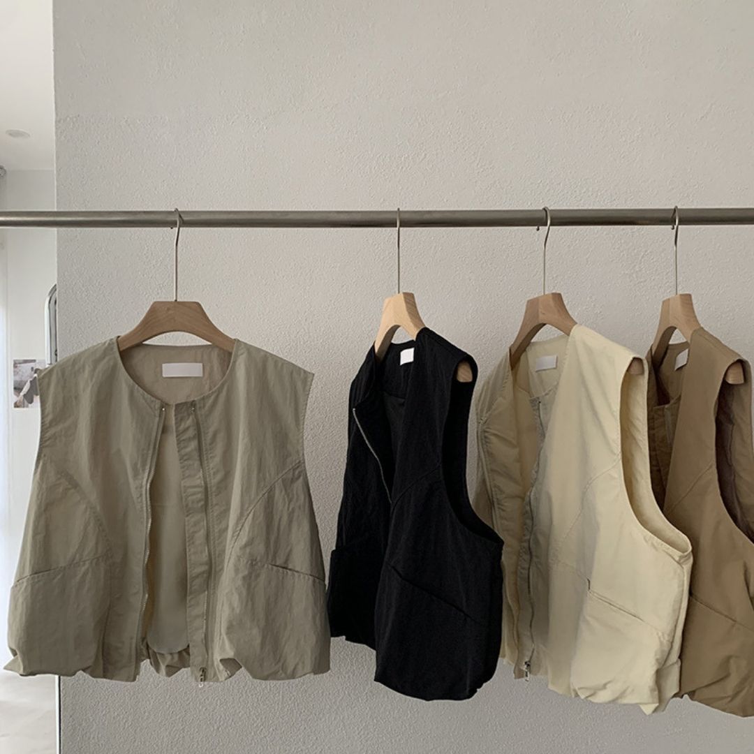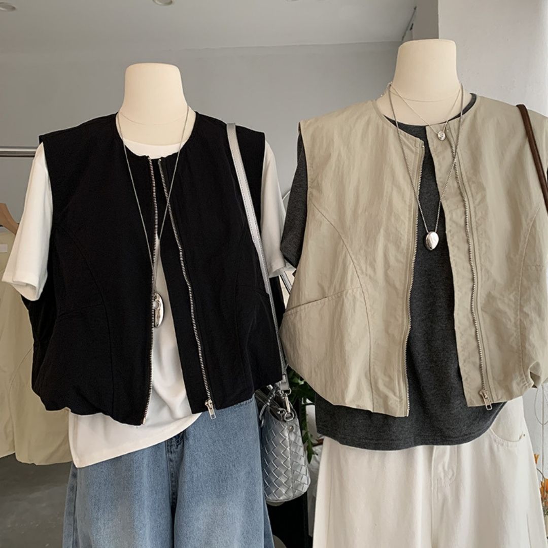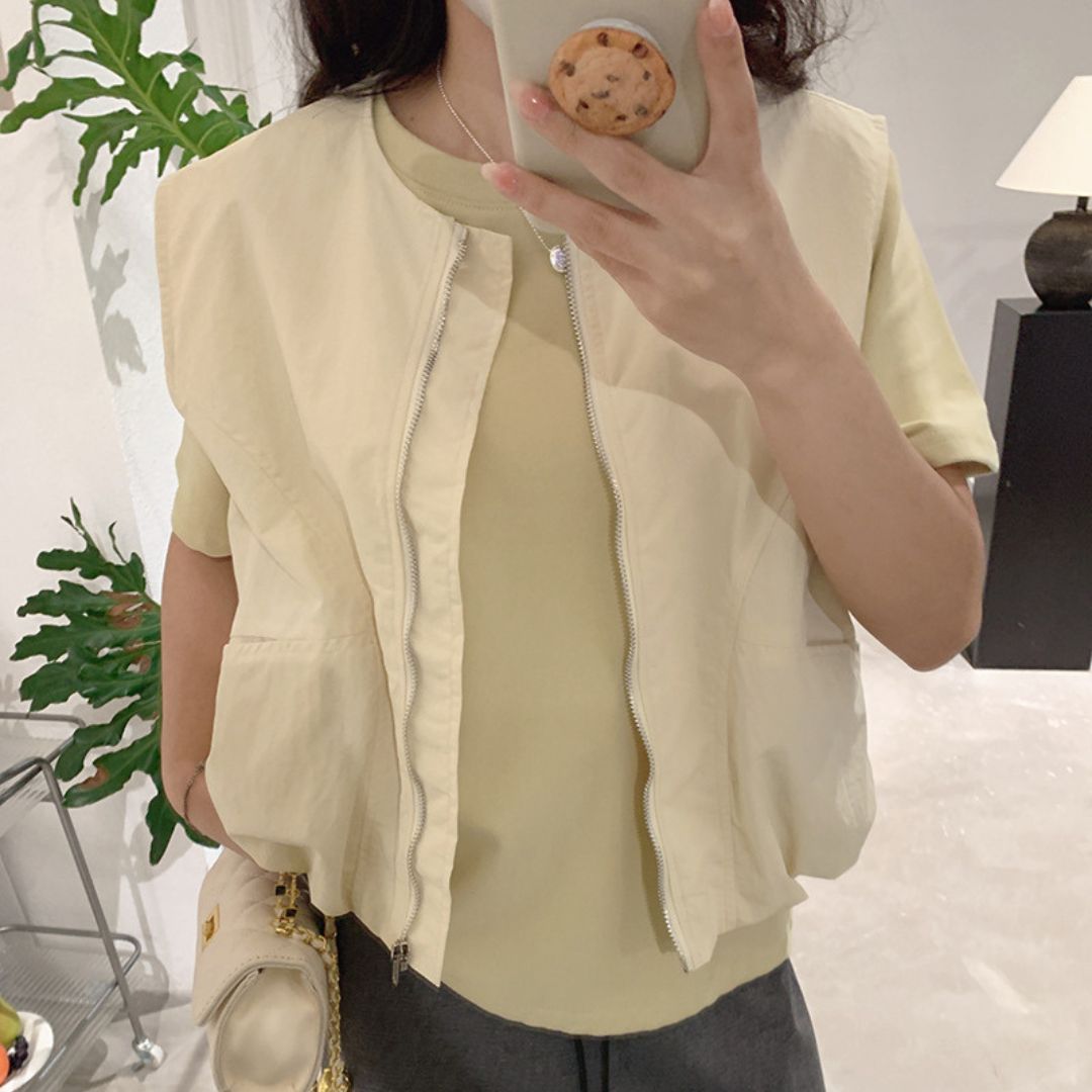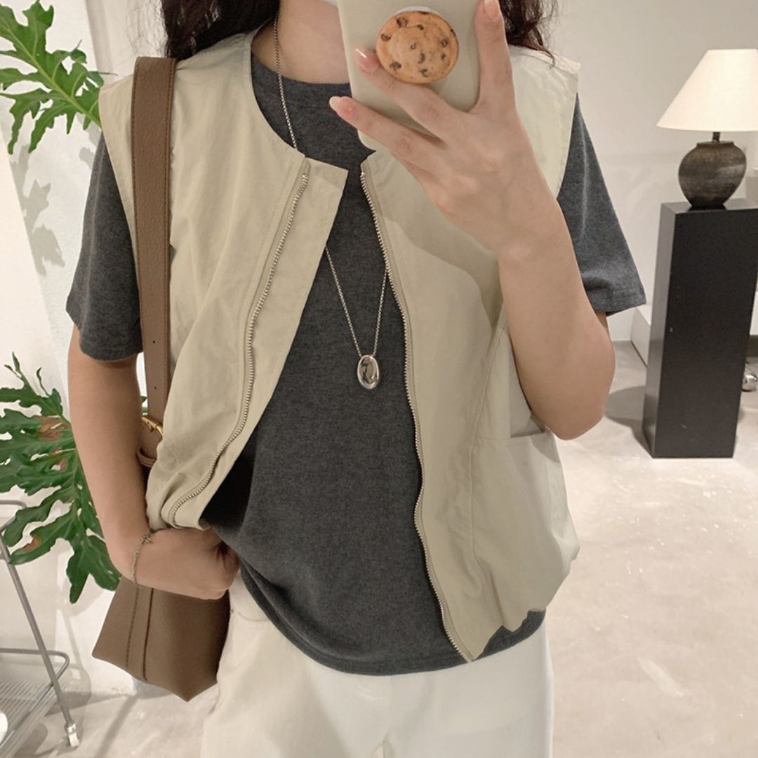 女士簡約斜口袋拉鍊背心